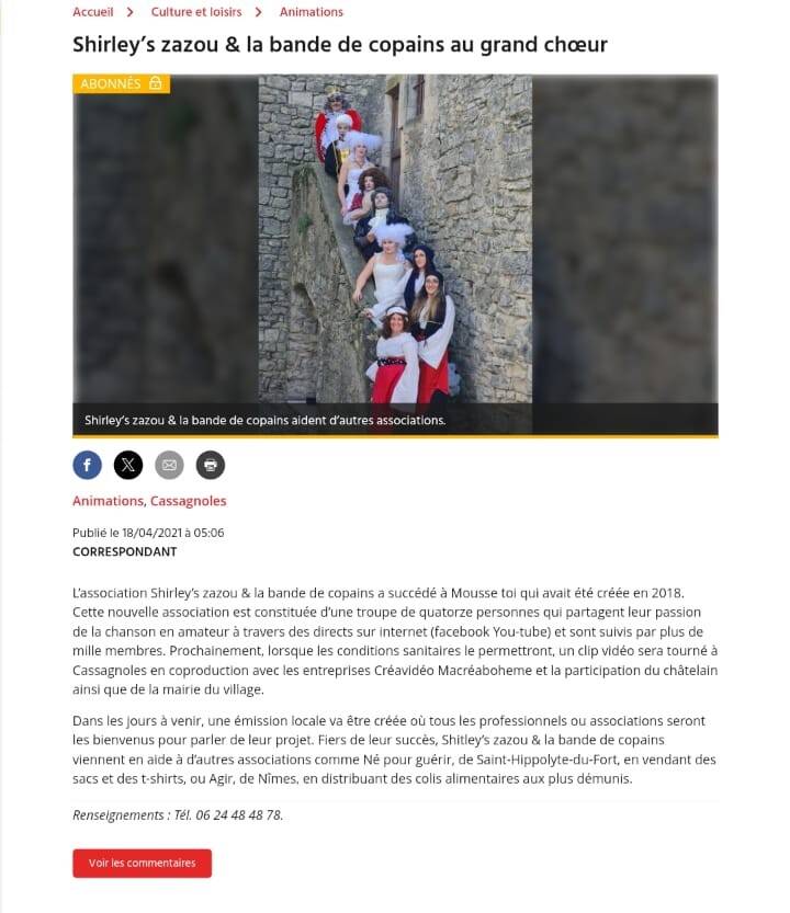 Association Shirley's est née de la passion pour le chant et l'envie de partager cet art authentique dans le village pittoresque de Cassagnoles . Nous croyons que chaque voix a une histoire à raconter et que l'expression personnelle est essentielle à la pratique musicale. Notre mission est de fournir des expériences enrichissantes lors de nos prestations musicales. Rejoignez-nous pour découvrir la joie du chant dans un cadre accueillant et inspirant.
